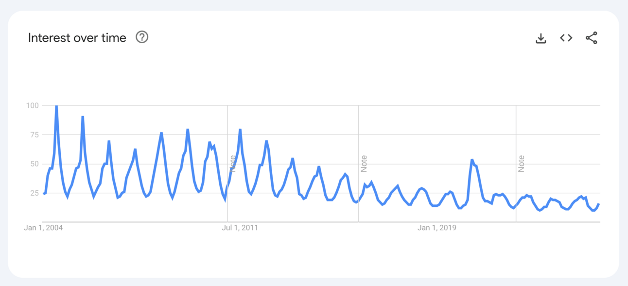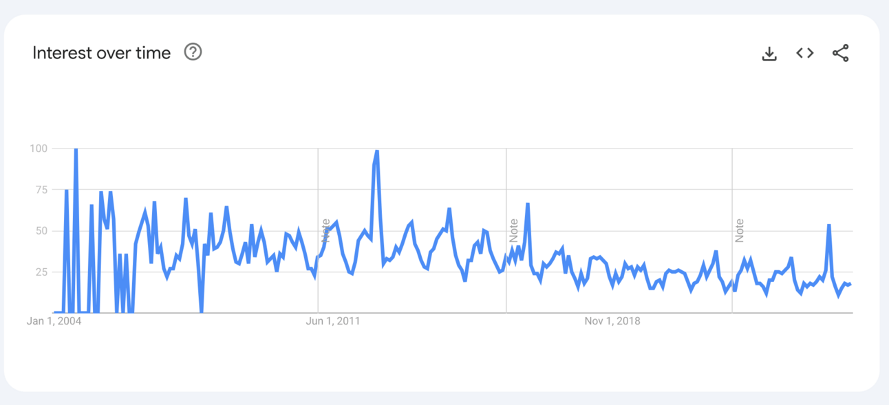 So, what was the cycling industry like during this peak, and how did it fare when the excitement around pro cycling waned? My research, based on search trends, shows that interest in road biking fell at the same time as the decline in pro cycling popularity. This can be seen by examining the interest in the search term "road bike" in the US, notably it sees a similar decline to pro cycling (see Fig. 3). Intrrestly, meanwhile, the terms “mountain bike” in the US (see Fig. 4) and “road bike” in the UK (see Fig. 5) didn’t see similar declines.This underscores that fall of road biking was unique to just road bikes and just the us. This supports my thesis that the fall of pro cycling in the US also contributed to decreased interest in road biking and, by association, road bike sales.