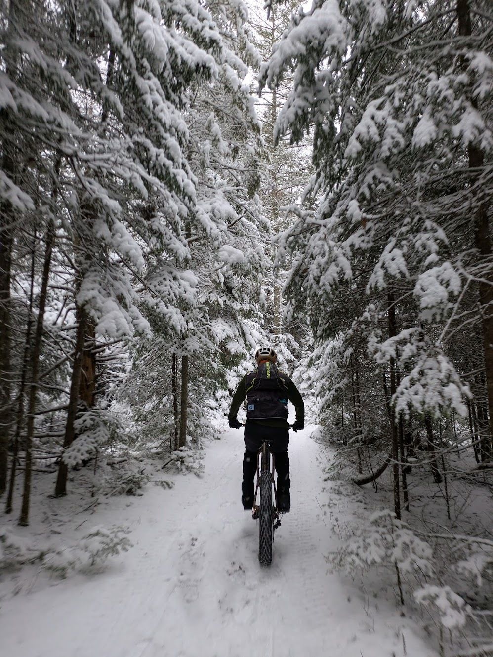 In some ways, fat biking has more in common with trail running than mountain biking. The way fat bikes ride is slower and less momentum-dependent than mountain bikes. Especially on snow, fat bikes have a higher rolling resistance and require a more steady grind of effort to ride. The result of this on the trail is that there are not as many opportunities to coast or pump through terrain. This also means in practice that there are less reward spikes in power, up a short climb or out of corners, for example. I have found that this characteristic forces me to settle into a rhythmic, industrial style of riding which further limits the quick dopamine hits that I expect on a normal mountain bike ride and leaves me with a lower and longer-lasting mood boost akin to a runner’s high.